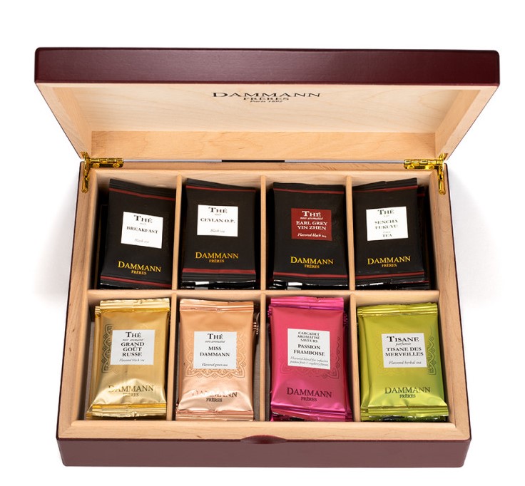 Coffret rouge en bois est garni de 48 sachets Cristal® individuellement enveloppés