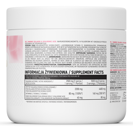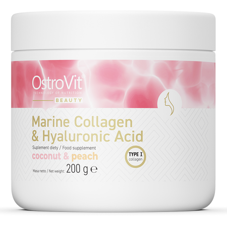 OstroVit Collagène Marin + Acide Hyaluronique + Vitamine C est un complexe de trois ingrédients actifs sous la forme d’une poudre aromatisée à la noix de coco et à la pêche à dissoudre dans l’eau. La préparation contient, entre autres, des peptides de collagène de poisson de type I, de l’acide hyaluronique et de la vitamine C. Le complément alimentaire est dédié à tous ceux qui se soucient d’une belle et saine apparence de la peau, ainsi qu’aux personnes qui font du sport, après des blessures sportives ou un effort physique intense.