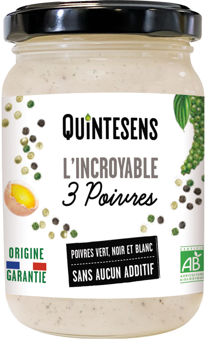 Huile de tournesol* France, jaune d’œuf* France (8%), vinaigre balsamique* (vinaigre de vin*, moût de raisin cuit*), poivre vert* (3%), moutarde de Dijon* (graines de moutarde* françaises, vinaigre d’alcool*, eau, sel), poivre noir* (1,5%), sel, jus de citron concentré*, poivre blanc* (1%), poudre de blanc d’oeuf*.